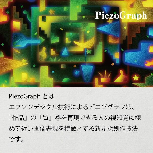 エプソンデジタル技術によるピエゾグラフは、「作品」の「質」感を再現できる人の視知覚に極めて近い画像表現を特徴とする新たな創作技法です。ピエゾ方式によるプリントヘッドは、熱を使わないため性能の劣化が少なく、耐久性に優れ、その 不変性は75年から100年と云われています。