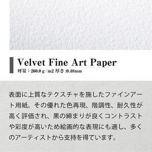 坪量:260.0g/m2 厚さ:0.48mm 表面に上質なテクスチャを施したベルベットファインアート紙。その優れた色再現、階調性、耐久性が高く評価され、黒の締まりが良くコントラストや彩度が高いため絵画的な表現にも適し多くのカメラマンやアーティストから支持を得ています。