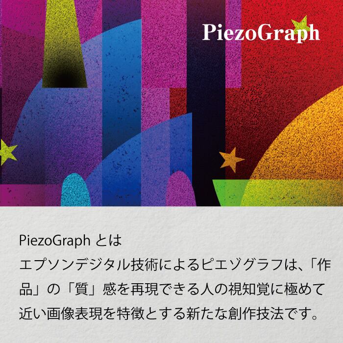 エプソンデジタル技術によるピエゾグラフは、「作品」の「質」感を再現できる人の視知覚に極めて近い画像表現を特徴とする新たな創作技法です。ピエゾ方式によるプリントヘッドは、熱を使わないため性能の劣化が少なく、耐久性に優れ、その 不変性は75年から100年と云われています。